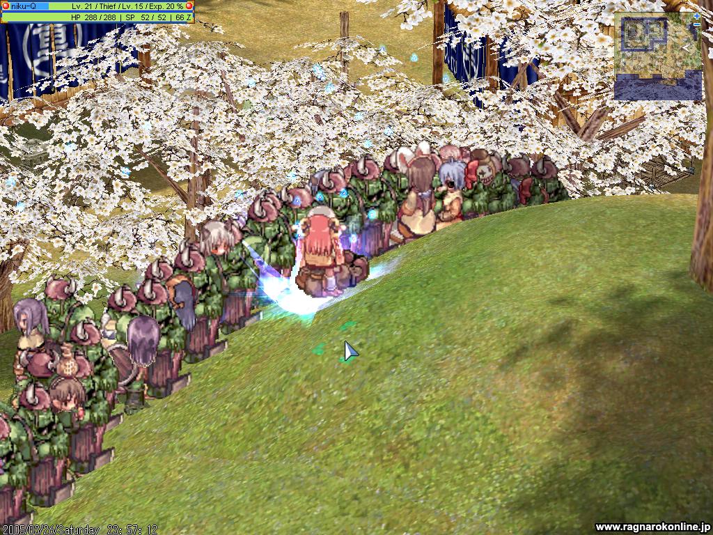 ID:FaCP+JI4 こちらLoki。 今剣士3,アコさん4、アチャ1です。 他のサーバはどーですか? 362 名前:(○口○*)さん :04/06/12 21:39 ID:FaCP+JI4 Loki、とりあえず出発準備中です。 剣士5人、アコ5人、アチャ1人、ネタアコさん1人、です。 今のところネタな人覗いて(笑)LV80と90でPT2個出来てます。 386 名前:(○口○*)さん :04/06/13 00:09 ID:iyjTnjNk Loki終了です。 GD3→監獄1→監獄2、というコースでした。 前衛メンバーが全員AGI型なのでほとんど食らわず、鬼のような速度で殲滅です。 監獄2でも普通にラクに狩りできてちょっとびっくりでした。 結局死んじゃったのはGD2で魔剣のSB受けて倒れた1人だけでした。 わいわい言いながら歩き回って楽しいお祭りでした〜 次回出来ればまたやりたいです。 今度はもう少し上の狩り場で遊べそうかな・・・? #案の定、周りはびっくりエモ多かったです(笑) 398 名前:(○口○*)さん :04/06/13 01:39 ID:iWI/Trt4 lokiのみなさんお疲れ様でしたー 次回開催する時はしっかり宣伝してまたみんなで集まりましょ〜 423 名前:(○口○*)さん :04/06/13 20:23 ID:5C662lXv LokiのSS まずは出発前に違う意味での永遠の1次なアコさんを中心に ttp://nekomimi.ws/~asanagi/cgi-bin/ragnarok/source/20040613200956-loki01.jpg 監獄2で ttp://nekomimi.ws/~asanagi/cgi-bin/ragnarok/source/20040613201207-loki02.jpg ほぼ近接なので、甘いものに群がるアリのようだったのが楽しかったですね(笑 次回やるときは 他の職の方も増えるといいですな 430 名前:(○口○*)さん :04/06/14 18:09 ID:Rz5I4ry5 Lokiの一次祭り、ちょっとだけ様子書いてみます。 *集合 告知にあった伊豆の左にある座標の切り株に集合。 最初はアチャさん、剣士さん数人で集まってたところポツリポツリとアコさん達が増えてきます。 適当に集まるまでまったりと会話して過ごし、9:30の時点で行き先を相談です。 集まったメンバーは剣士5人、アコ5人、アチャ1人、ネタ1人(汗)です。 ちょうどLV90台5人、LV80台6人でアコさんも都合良くLV相応に分かれたので、 PT配分はすごく楽でした。 行き先はさすがにみんな1次だけあって控えめに考えます。 いろいろ意見が出ます。 その中で「なにも一カ所だけじゃなくてもいいんじゃない?」という意見にみんな賛成。 1時間程度で次の狩り場に行きましょう、という事で同意しました。 最初の候補地はGD3。 理由は 「DOP先生は最強の1次職だよね?」 「師匠だ!」 「挨拶に行かなきゃ!」 という、1次ならでは(?)の理由でした。 (この時点であまりデスペナとかは気にするような方はいませんでした) 各自装備整えてGD3に出発です。ひとまずGD入り口で集合になります。(続く) 431 名前:(○口○*)さん :04/06/14 18:30 ID:Rz5I4ry5 *GD3 GD前集合です。 GDの入り口、壁際にアコ&剣士&アチャがずら〜〜っと並びます(笑) この時点で道行く人がびっくりエモ。第一作戦成功です(? そろった時点でゾロゾロとGD1を行進です。シャアがこようがあっという間に粉砕。 何事もなくGD2へ。 GD2も闊歩。途中ほとんど敵が出ません(泣) と、おもいきやGD3入り口手前で1次の死体の山が… 魔剣登場です。 掃除に来た2次の人よりも先にこっちに向かってきたので全員で総攻撃。 AGI型剣士5人が止めどなくバッシュをたたき込み、アコ集団が容赦なくHL、アチャのDS。 途中無念にも魔剣のSBを受けて1人犠牲に(T▽T が、ものの3,4秒でKO。掃除にきてた2次の人ポカーン。 そそくさと犠牲者を復活させて何事もなかったようにGD3に行きます。 GD3でDOP先生を捜します。 さすがに時間帯が合わなかったせいか、先生は留守のようです。 仕方ないので右上の墓地が空いていたので、ここに陣取りしばしまったり。 結構沸く場所なのですが、沸いた瞬間にバッシュとHLとDSの猛襲が(汗) 先生、デビルチが2秒持ちません。馬が1秒です。斬りに行く前に沈んでます(汗) 改めて次の狩り場の相談。 結構強い(というか無茶苦茶強い)のでもっとムリしてもOKだね? と言うことで騎士団とか監獄、ノーグロードと意見が出ます。 騎士団はBdSで即死率高いからきついね、という事でボツ。(耐えれる人は数人いました) ノーグもいまいち乗り気な人が少なくてボツ。 残る監獄2でフェンダークをこてんぱん!にしよう、という事で合意。 最後にもう一回DOP先生探してみよう、という事でぐるりとGD3を一周。 ・・・いません(T▽T そそくさとGD3を後にすることにしました(続く) 432 名前:(○口○*)さん :04/06/14 23:21 ID:uhVreULI 続きマダー(チンチン 433 名前:(○口○*)さん :04/06/15 02:01 ID:0948VVZv *監獄1 一路監獄へ。 ゲフェで準備を済ませて西門からぞろぞろと行進。 順路にいたコボルトやプティが一瞬でコナゴナなのは言うまでもありません。 まさに歩いた後はペンペン草も生えない状態で(ぉ? GH到着。やっぱりぞろぞろと城前まで行進。 途中新婚旅行(?)にきていた人と鉢合わせ。双方びっくりエモ(笑) 吸い込まれる様に城内部へ。 途中鏡がいたような気がしますが…まぁコナゴナという事で。 監獄到着。一路2Fを目指します。 が、2F手前がモンハウ。バッシュとDS、HLが飛び交います。 ・・・先生、や